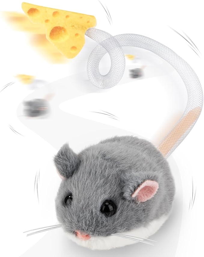 • Lifelike and irresistibly cute – This plush mouse with fur cover, shiny eyes, pink ears and whiskers is simply adorable. The long, wiggling tail and squeaky function instantly attract your cat’s attention and awaken their natural hunting instinct. If your cat is a little shy, you can let them play with the toy first before activating it so that they can first familiarize themselves with this new friend.