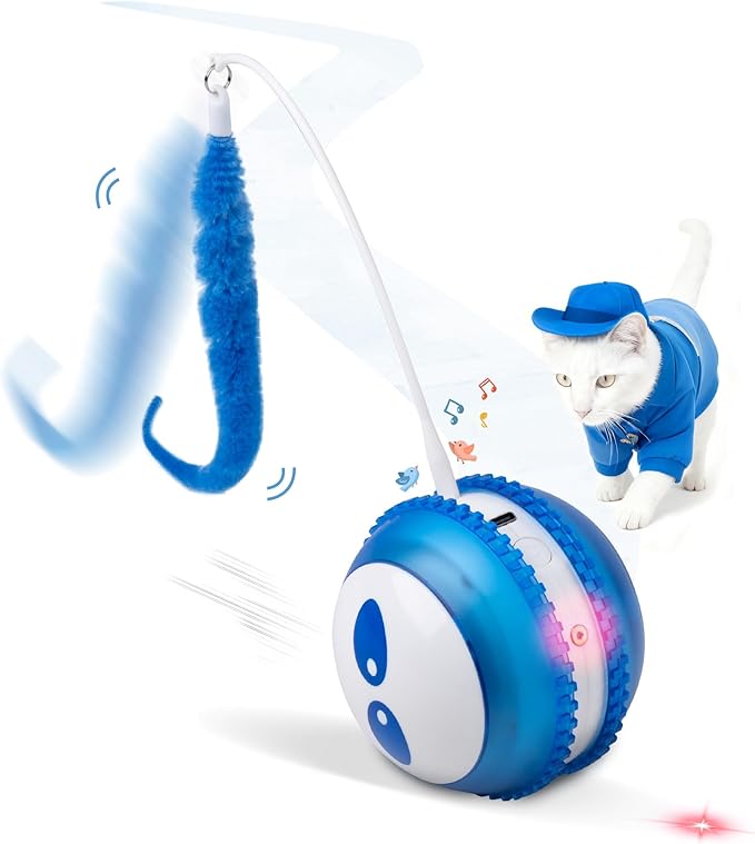 • **THREE PLAY VARIATIONS – A ENJOYING EXPERIENCE** Discover the ultimate fun for your cat: Our 3-in-1 activity system combines a self-rolling ball, a spring fishing rod and a precise laser pointer. Whether your pet prefers to hunt, jump or puzzle – this toy trains instincts, promotes intelligence **and keeps even demanding velvet paws enthusiastic for hours.