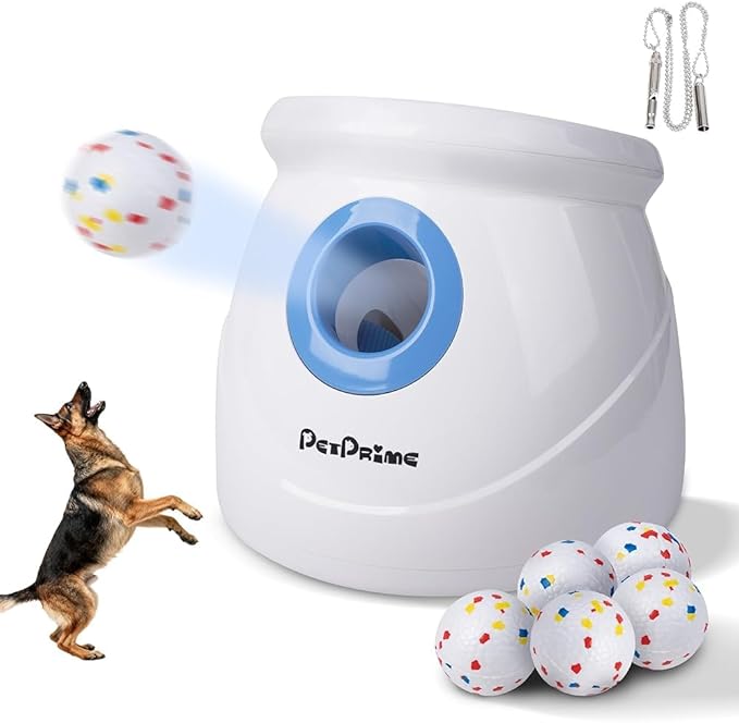 - High quality: this ball launcher is made of ABS plastic and can be used both indoors and outdoors. List of products and accessories: 1 ball machine, 1 power supply, 6 ETPU balls (6.35 cm), 1 x instruction manual (English language not guaranteed), 1 x whistle. The ball machine is rechargeable and easy to use.
