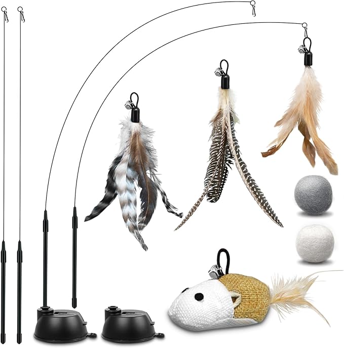 - A versatile toy set: Contains 2 suction cups, 4 angles, 1 handmade mouse, 2 natural wool balls and 3 feathers with bells, this cat toy set offers a variety of entertainment options for your cat.